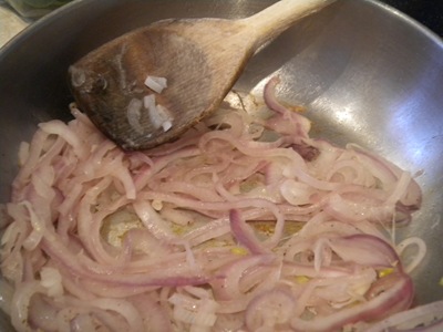 Step one: get some red onions nice and caramelized (due to my mom’s love affair with her new mandoline and overexpectation of how many guests would be at Christmas Eve, we have a ridiiiiiiculous quantity of red onions around. Expect to see a lot of them).