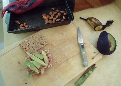 Then, an adorable sandwich. The last of the homemade focaccia; avocado; and mashed kidney beans. This is an experiment. I love the hummus and avocado combo, but it seemed silly to make hummus when we had an open container of red beans. (Reports, though unconfirmed, have surfaced that some other people actually get sick of beans. I find this mystifying, but whatever). Anyway, I’m hopeful. I like the colors.