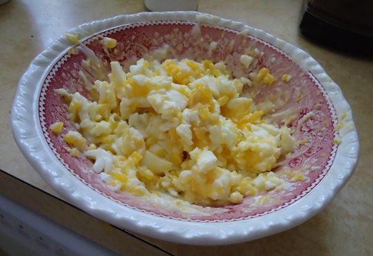 And sure enough, she whipped up some hardboiled eggs (after a little delicate suggestion from me to start them in cold water…) and made a gorgey egg salad.