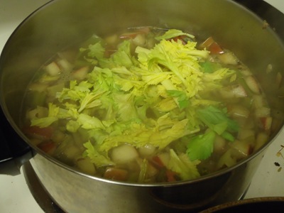 Bring some veggie stock (you know me, mine was homemade :D) to a boil, toss all that stuff in, cook to tenderness, adding the celery leaves at the end to cook those too.