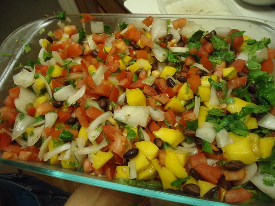 Fresh tomatoes, onions, cilantro, jalapeno, lime, mango, and black beans made for a happy, well rounded, and delicious salsa.