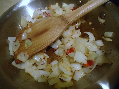 And I got to cooking some onion, cumin and mustard seeds, hot pepper, garlic, ginger