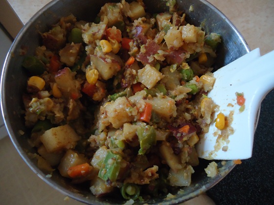 Add 2 tsp. canola oil. Add potatoes, onion, and green pepper, and cook for ten minutes. Add frozen vegetables and cook an additional five minutes. Add breadcrumbs and water and stir vigorously to scrape up flavorful brown layer from the bottom of the pan. Reduce heat to low. Return spice mixture, add salt and pepper to taste, and sprinkle with sugar. Cook an additional five minutes, or until potatoes are tender. Remove skillet from heat,